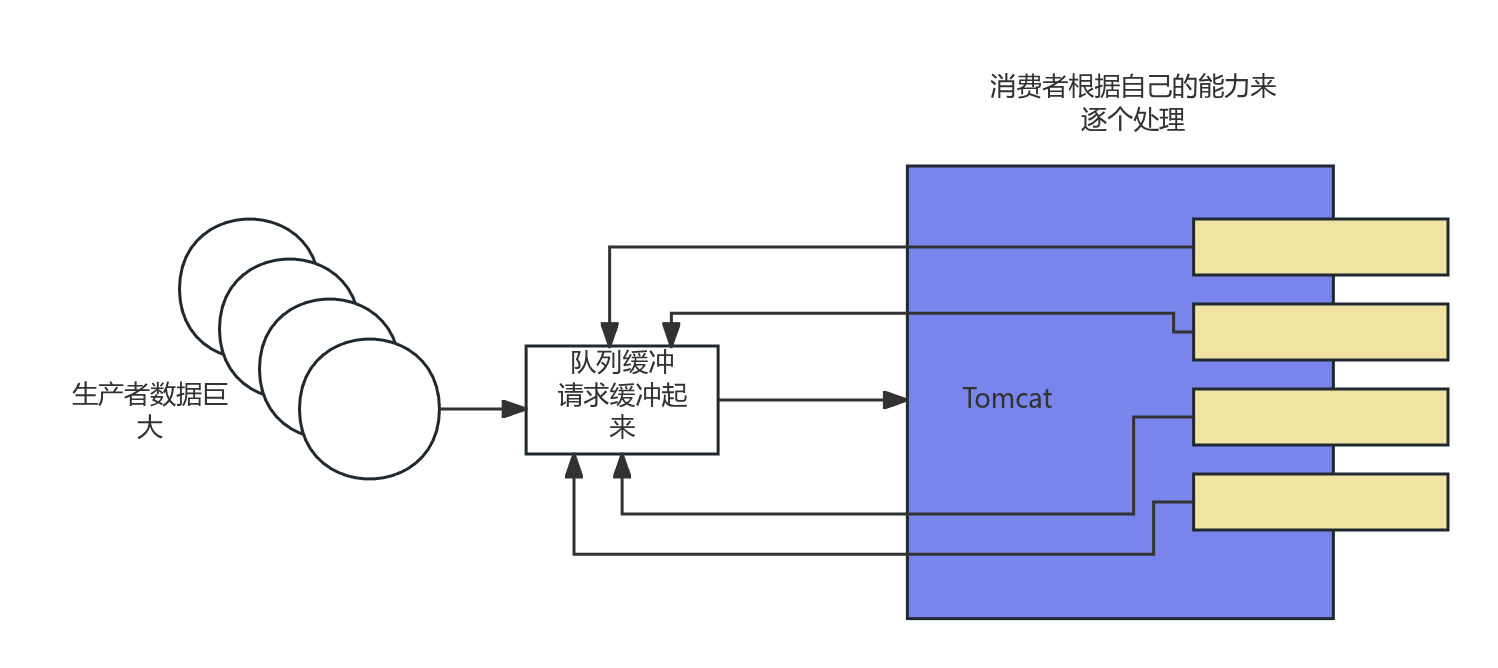 消费者(Consumer):图右侧的方框代表消费者,即处理这些数据的服务(例如图中的Tomcat和它后面的处理线程)。