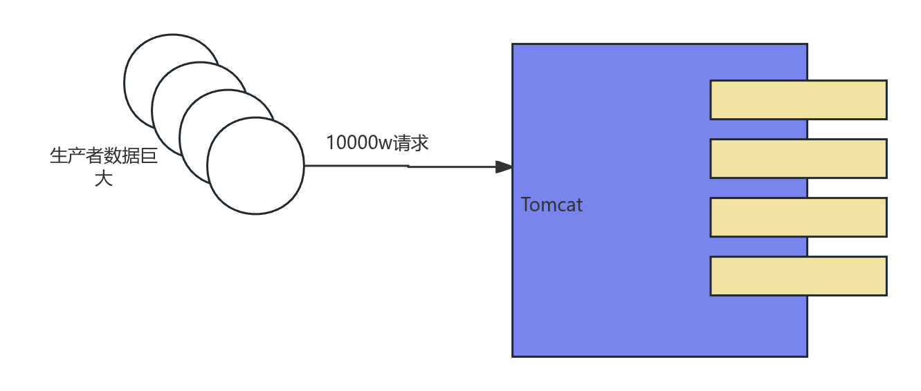 生产者(Producer):图左侧的“生产者”代表数据源。它拥有“巨大”或“大量”的数据,并以 10000w/s 的高速度源源不断地产生请求。